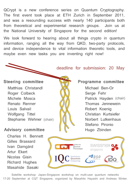 Japan-Singapore Workshop on multi-user quantum networks, 17th-20th September 2012, CQT Singapore, organized by Masahito Hayashi and Andreas Winter. More info.